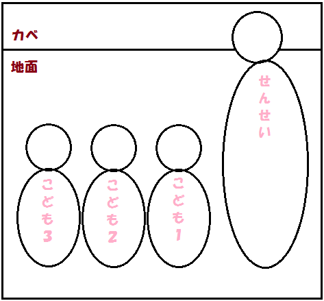 ↑ 前年の課題、「お店やさんごっこ」 とかはこのパターンが使えました。他にも工作とかお弁当の時間などにも。(お弁当の時間の場合は先生の位置に少し工夫がいりますが。)