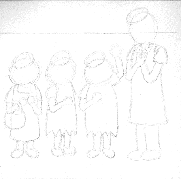 四人が ズラッ と一列に並ぶというなんとも動きの無いパターンですが・・・。保育士、子どもの顔や腕の位置・向き・ポーズはその時々で変えます。さて見ての通り、今回試験で描いた絵もこのパターン。