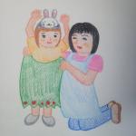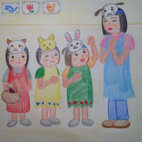 自分の体験から、お遊戯会の時にカラフルなビニール製の衣装(?)を着てたのを思い出してそれを書きました。お面は、一瞬 「・・・?!」 となったけど、前年度の課題「お店やさんごっこ」 の受験者の方の再現絵を拝見した時になんか頭にかぶっている子が居たのを思い出してソレを参考にしよう!と思って描きました。